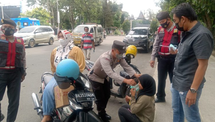 Personil Polres Siantar saat memasangkan masker kepada warga